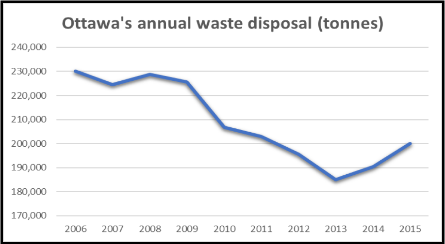 Waste Watch Ottawa’s detailed analysis of online Ontario data of provincial waste diversion from disposal performance and a City of Ottawa 2014/2015 report obtained via a municipal freedom of information request, was conducted with the assistance of University of Ottawa students and Councillor Jeff Leiper’s office. Based on a review of municipal best practices, options are offered to improve the design and effectiveness of recycling and green bin programs, solid waste diversion policies and programs, and waste collection and processing activities in Ottawa.