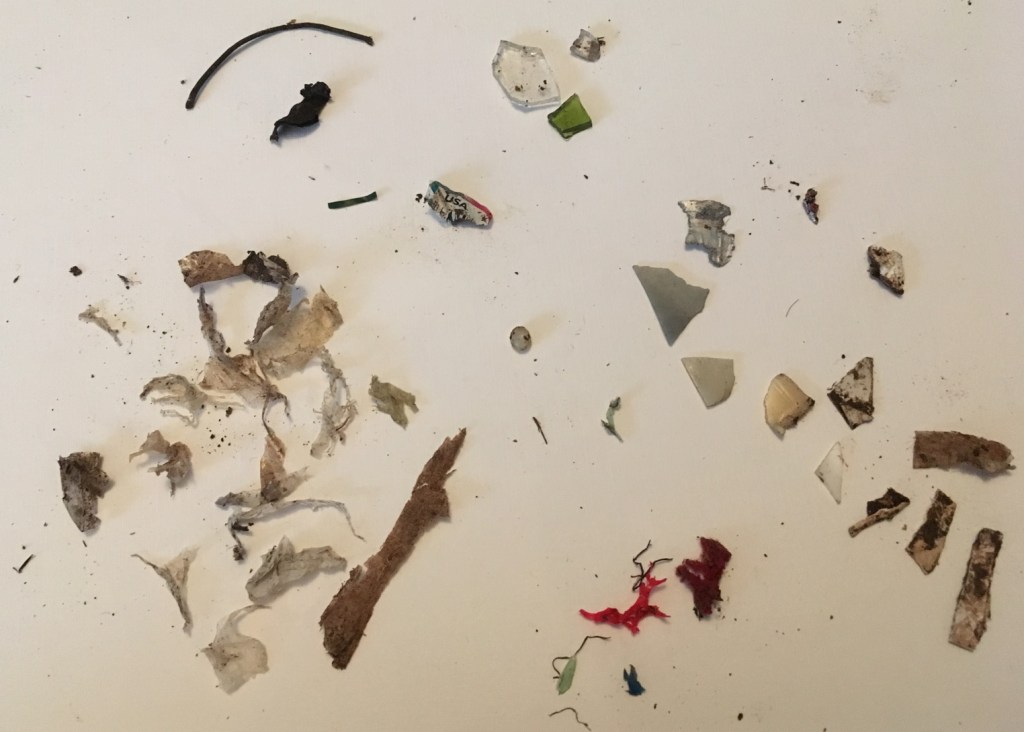 Plastic bags – bristle (top), black tar-like material, plastic sticker, glass (3 pieces, top), plastic packaging (bottom), foil, hard plastic pieces